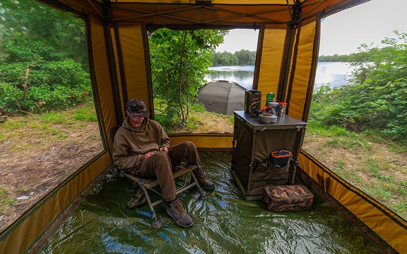Das Social Shelter ist der perfekte Ort zum Zusammensitzen bei langen Ansitzen oder wenn sie zum Beispiel eine längere Tour mit Ihrer Familie machen. Das Zelt ist der ideale Ort, um täglich zu kochen, zu essen, Rigs zu binden, Köder vorzubereiten oder generell zum gemütlichen Beisammensein.